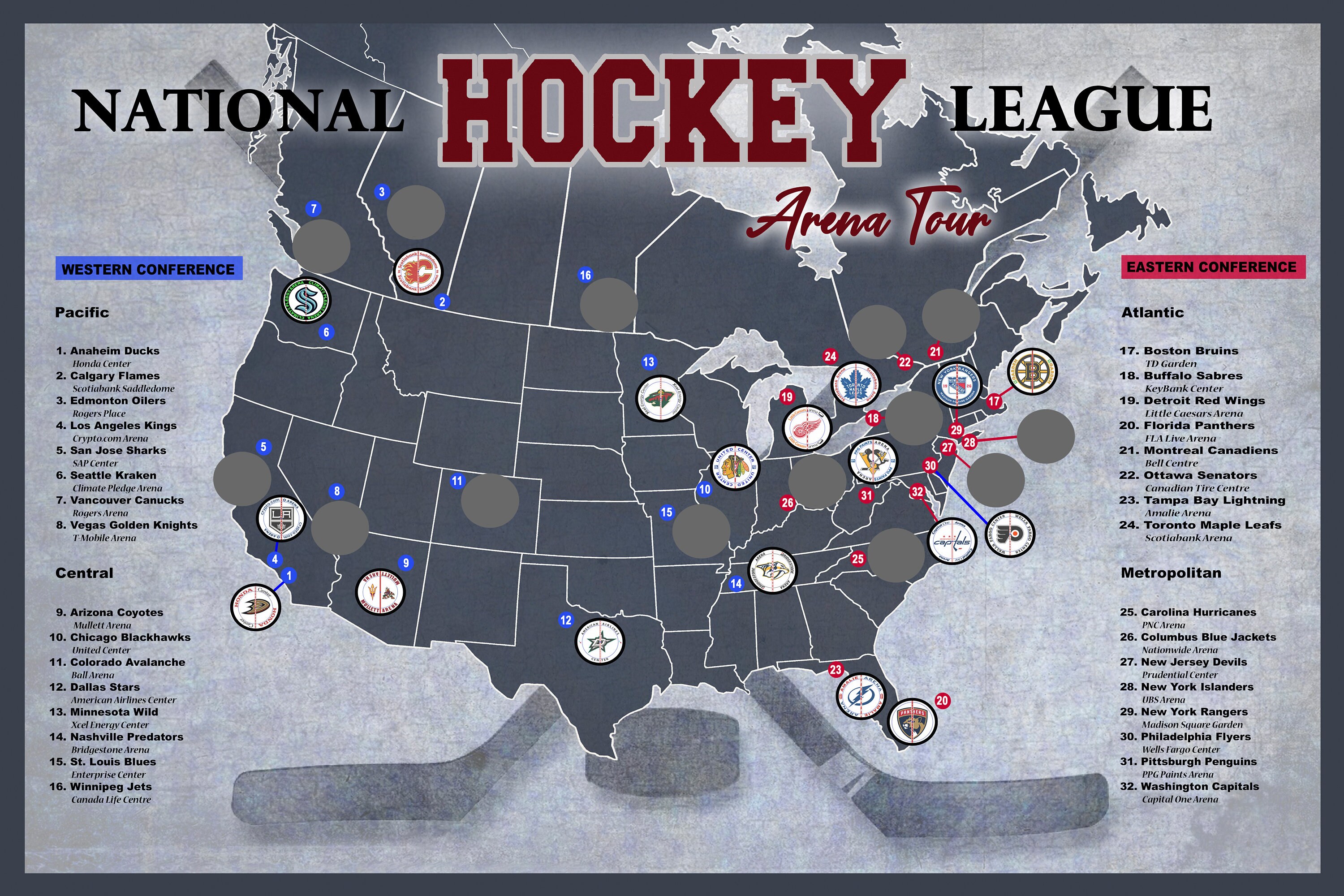 Nhl Arena Map Amazon. GEOJANGO Hockey Arena Map Poster (24Wx16H): Earlier on Friday, Action Network released a ranking of every NHL arena by how much it costs for a family of four to attend. The total cost was calculated by adding up the price of four general . Action Network’s analysis revealed that the most affordable rink in the league… is a place you can’t see NHL games in anymore: Mullett Arena in Tempe, Arizona, the former home of the Arizona .